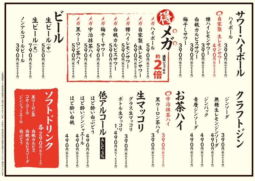 看板商品の”和牛カルビ”と合うように、さっぱりとした味のお酒をラインナップ。大変お得な”メガ”サイズもあり、お酒を存分にお楽しみいただけます。また、アルコール度数の3%と低めの”ほど酔い”カテゴリーやノンアルコールビールもご用意。自分にあった飲み方ができます。