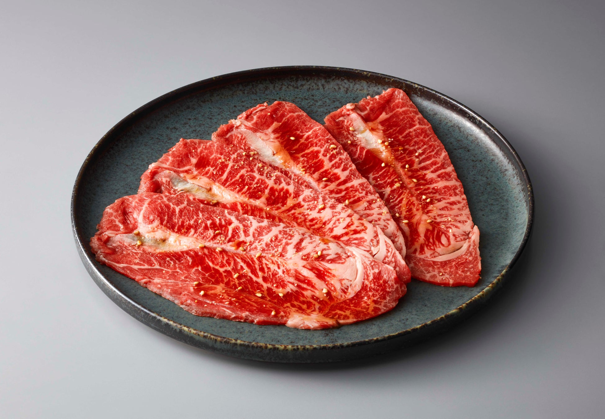 和牛の三角バラを塊肉の状態から、1枚1枚店内手切り。脂の濃厚な甘みと強い風味が特徴で、一口食べた時の満足感を味わっていただくため、1枚のカットを大切りでご提供。