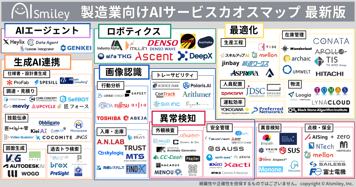 製造業向けAIサービスカオスマップは、課題解決の手がかりや最適化技術による生産プロセスの効率化、AIエージェントを活用した業務支援として急速に進化するAIソリューションを6カテゴリーでわかりやすく分類化したカオスマップです。