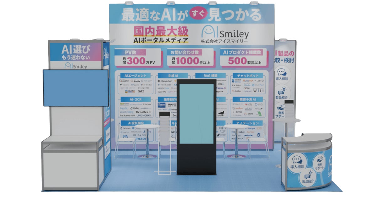 会場では、最新のAIソリューションやニュース等を集めるAIポータルメディア「AIsmiley」活用方法のご案内と、AI導入のご相談を受け付けております。皆さまのご来場を心よりお待ちしております。