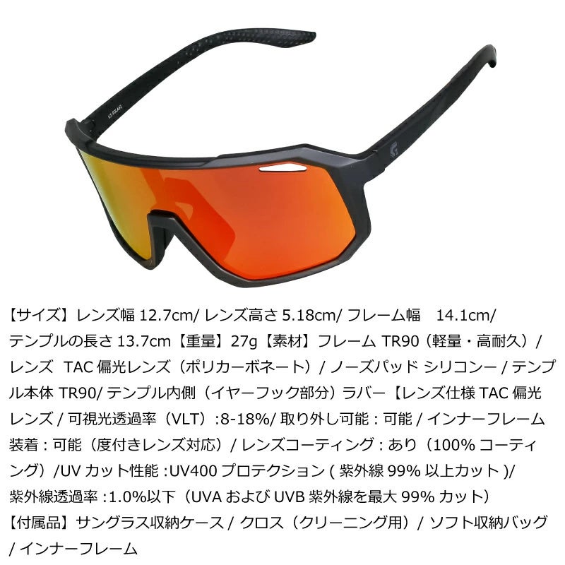 TAC偏光レンズ/可視光透過率(VLT):8-18%/取り外し可能:可能/インナーフレーム装着:可能(度付きレンズ対応)/レンズコーティング:あり(100%コーティング)/UVカット性能:UV400プロテクション(紫外線99%以上カット)/紫外線透過率:1.0%以下(UVAおよびUVB紫外線を最大99%カット)  |