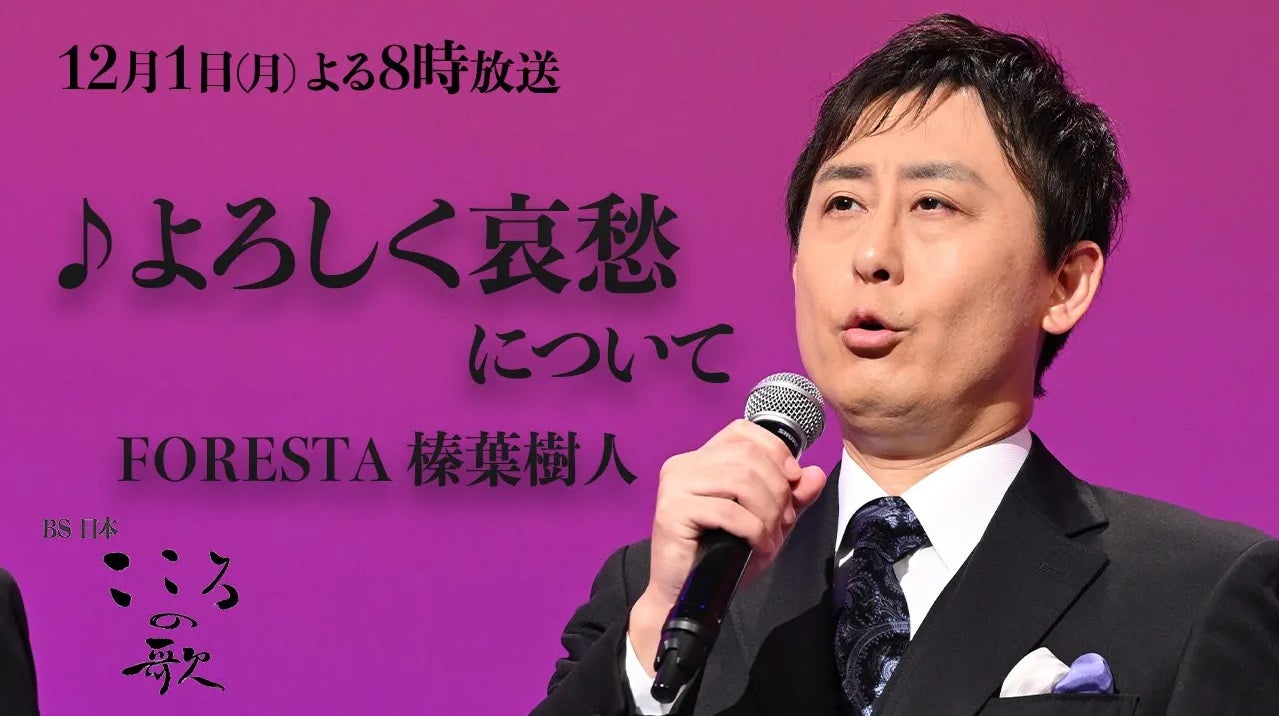 12月1日(月)よる8時から放送の「BS日本・こころの歌」は、『颯』と銘打って、新旧御三家の往年の名曲を披露します。昭和の元祖御三家と言えば橋幸夫、舟木一夫、西郷輝彦。そして新御三家と言えば郷ひろみ、西城秀樹、野口五郎。「潮来笠」「いつでも夢を」「絶唱」など、これまで番組やコンサートで何度も披露されてきたFORESTAお馴染みのレパートリーに加え、「ラスト・シーン」「銭形平次」「どてらい男」など、今回初放送となる楽曲が計5曲!是非お楽しみください。