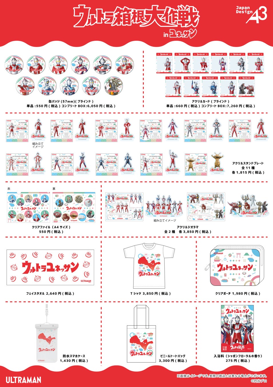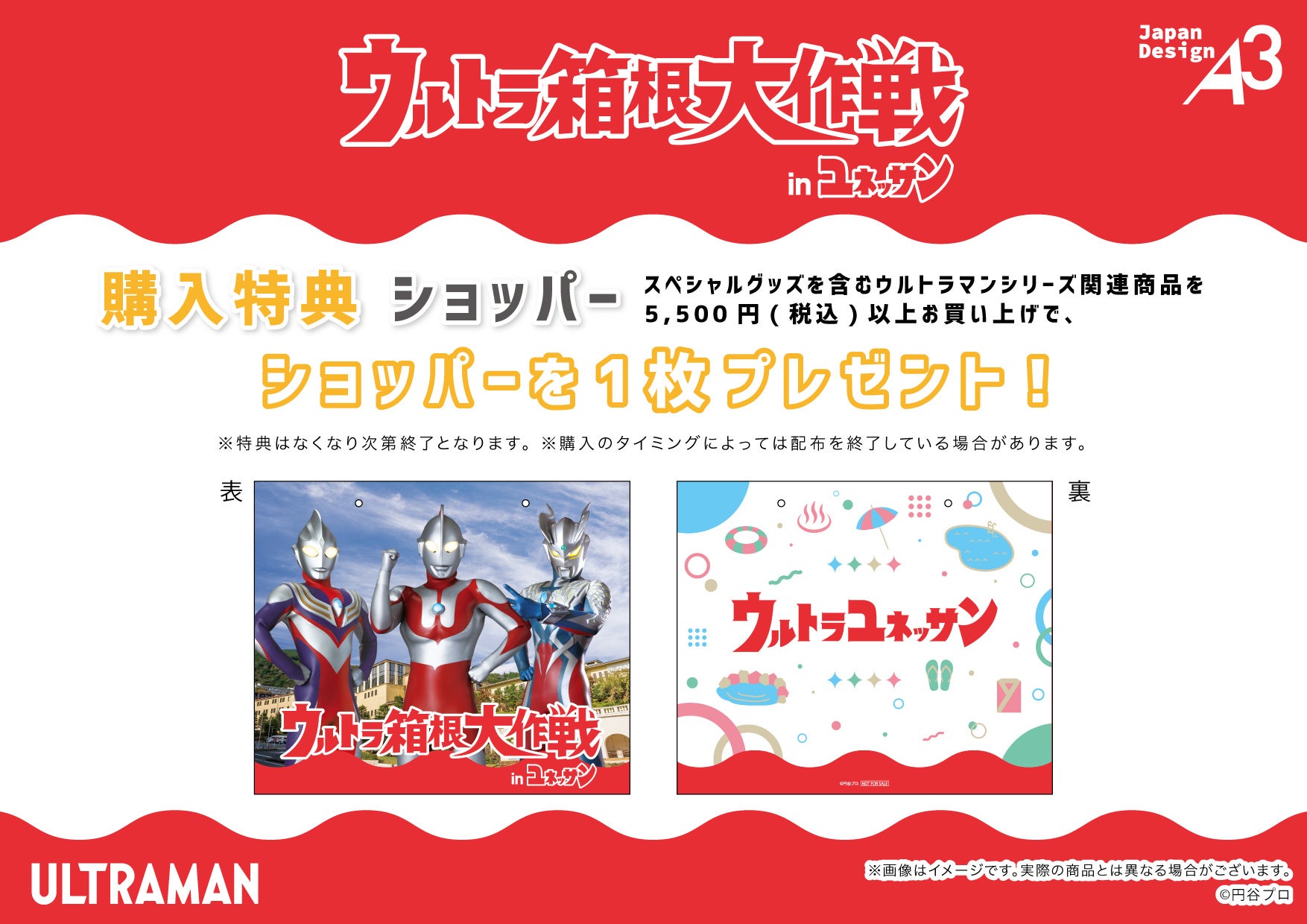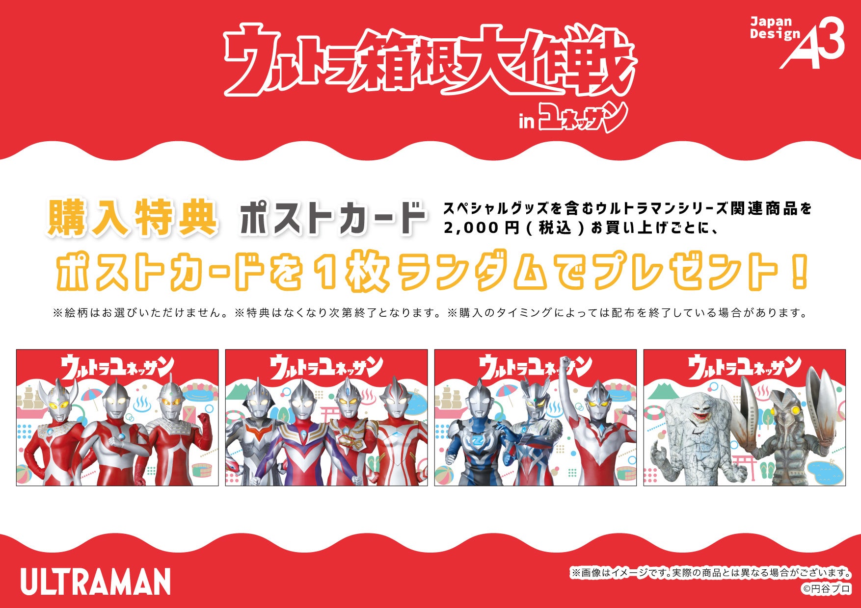 当イベント限定のスペシャルグッズを販売!フェイスタオルや入浴料、防水スマホケースなどユネッサンならではの商品もご用意しております。さらに、スペシャルグッズを含むウルトラマンシリーズ関連商品を2,000円(税込)ご購入ごとにポストカード(全4種)をランダムで1枚、5,500円(税込)以上のお買い上げでショッパーを1枚プレゼントいたします。