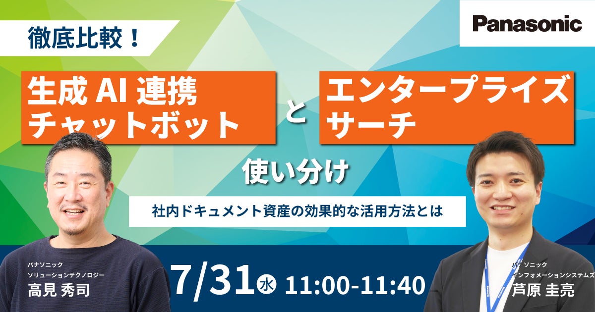【ウェビナー】7/31(水) 徹底比較!生成AI連携チャットボットとエンタープライズサーチの使い分け~社内ドキュメント資産の効果的な活用方法とは~
