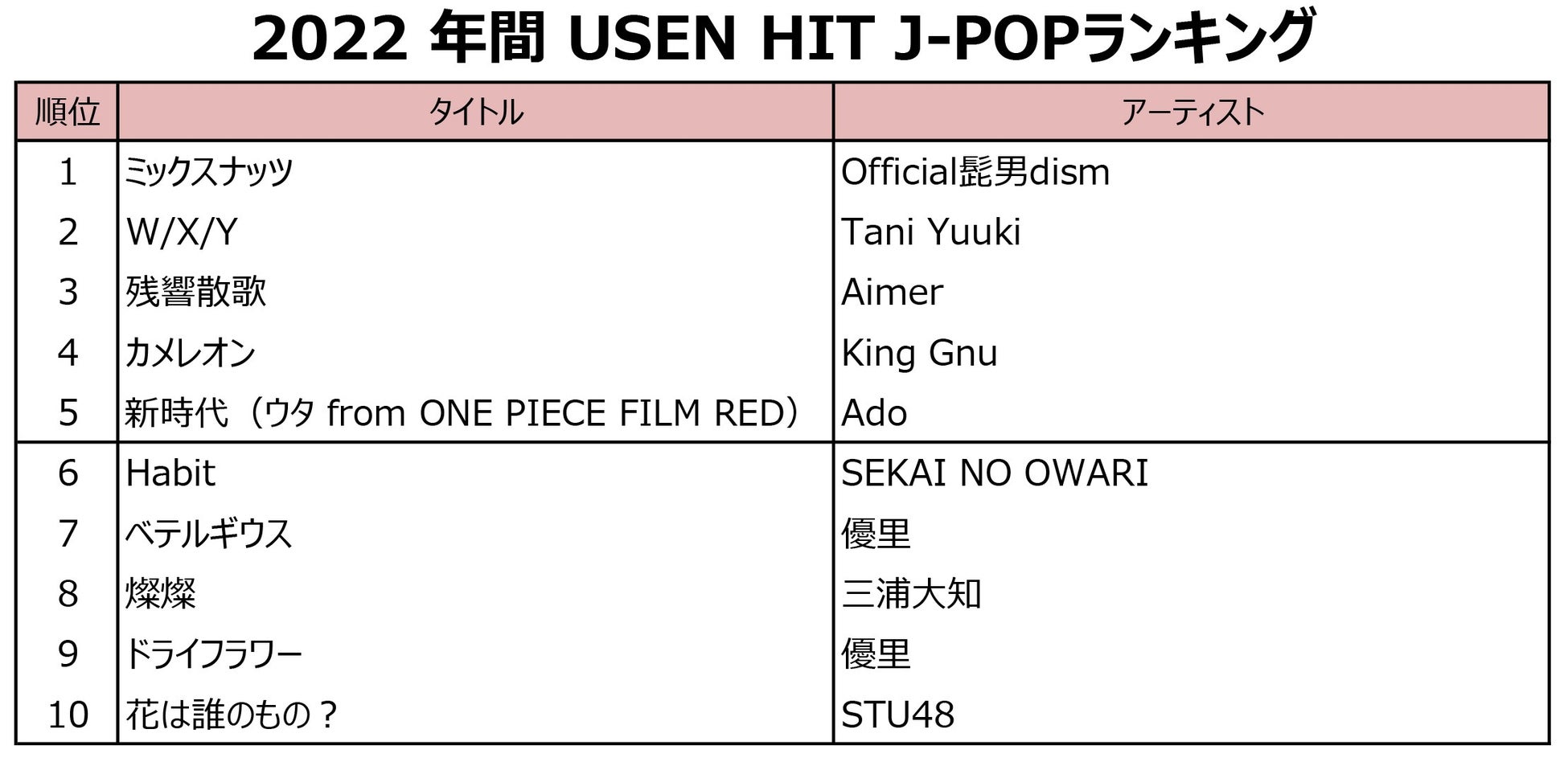 2022 年間USEN HIT J-POPランキング TOP5:https://youtu.be/Jm-wr_43_Cs