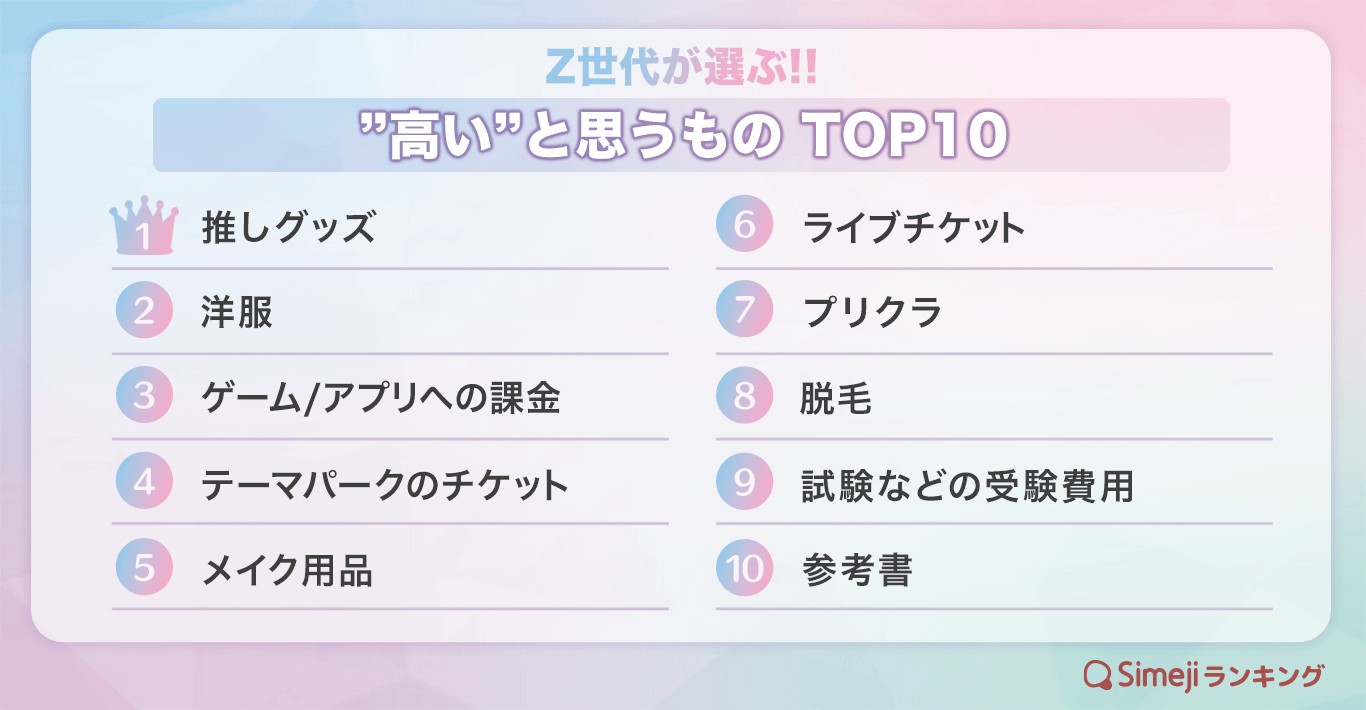 【Simejiランキング】Z世代が選ぶ!!「“高い”と思うものTOP10」
