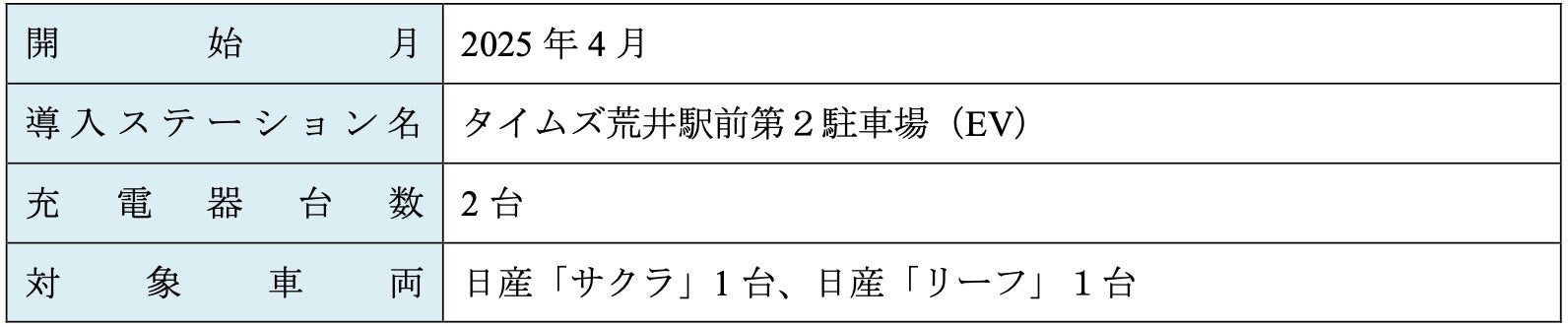 今回新たに、荒井駅前のタイムズカーのEVカーシェアステーションにおいて、地産地消型再エネ電力による充電を行えるようにします。
