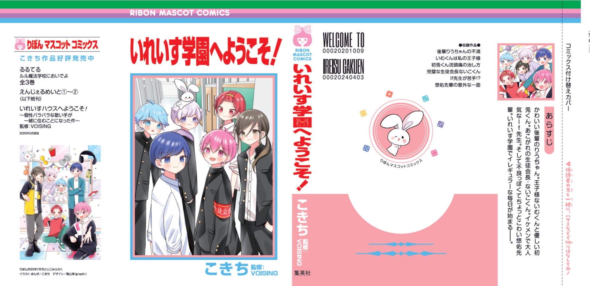 こきち氏による、話題沸騰中の2.5次元歌い手グループ「いれいす」のコミカライズ連載作品『いれいすハウスへようこそ! ~個性バラバラな歌い手が一緒に住むことになった件~』のコミックスが5月23日(金)に発売されました。これを記念して、とじこみ付録に「いれいす コミックス付け替えカバー」がつきます。表面は伝統的なりぼんマスコットコミックスをオマージュしたデザイン、そして裏面はこきち氏が新たに描きおろしたパロディ『いれいす学園へようこそ!』の4コマまんがが収録されています。