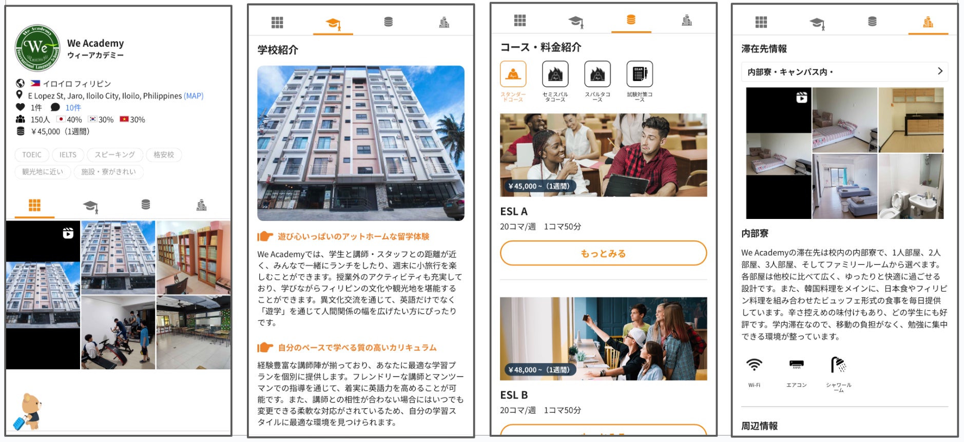 ネイティブキャンプ留学では、ユーザーが必要な情報を分かりやすく把握できるよう、常に丁寧で明確な情報提供を心がけています。We Academyの詳細情報は、以下の4つのカテゴリーに分けて掲載しており、知りたい情報を的確にお届けします。