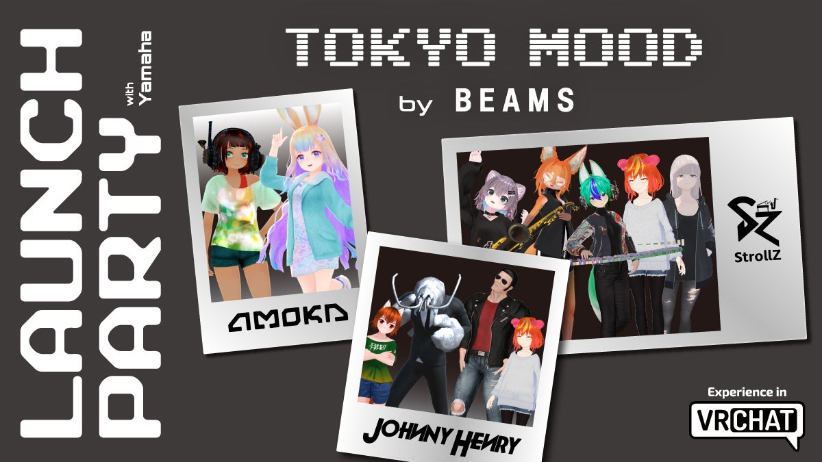 ワールド公開初日(5月31日)には、ヤマハ株式会社とのタイアップで、こけら落としライブ「Tokyo Mood by BEAMS Launch Party with Yamaha」を開催しました。同社が選出したのは、バーチャル音楽シーンで活躍する人気アーティスト、AMOKA、StrollZ、JOHNNY HENRYの3組。ワールド内BEAMS店舗前の路上で、約50名の先着枠を勝ち取った観客を前に熱いパフォーマンスを披露し、BEAMS公式YouTubeチャンネルでもこの様子を生配信でお届けしました。VRで音楽活動をするアーティストの多くは、同社が提供するSYNCROOM(読:シンクルーム)というソフトウェアを使い、遠く離れたメンバー同士でも、まるで同じ部屋にいるかのように、リモートセッションを楽しんでいます。