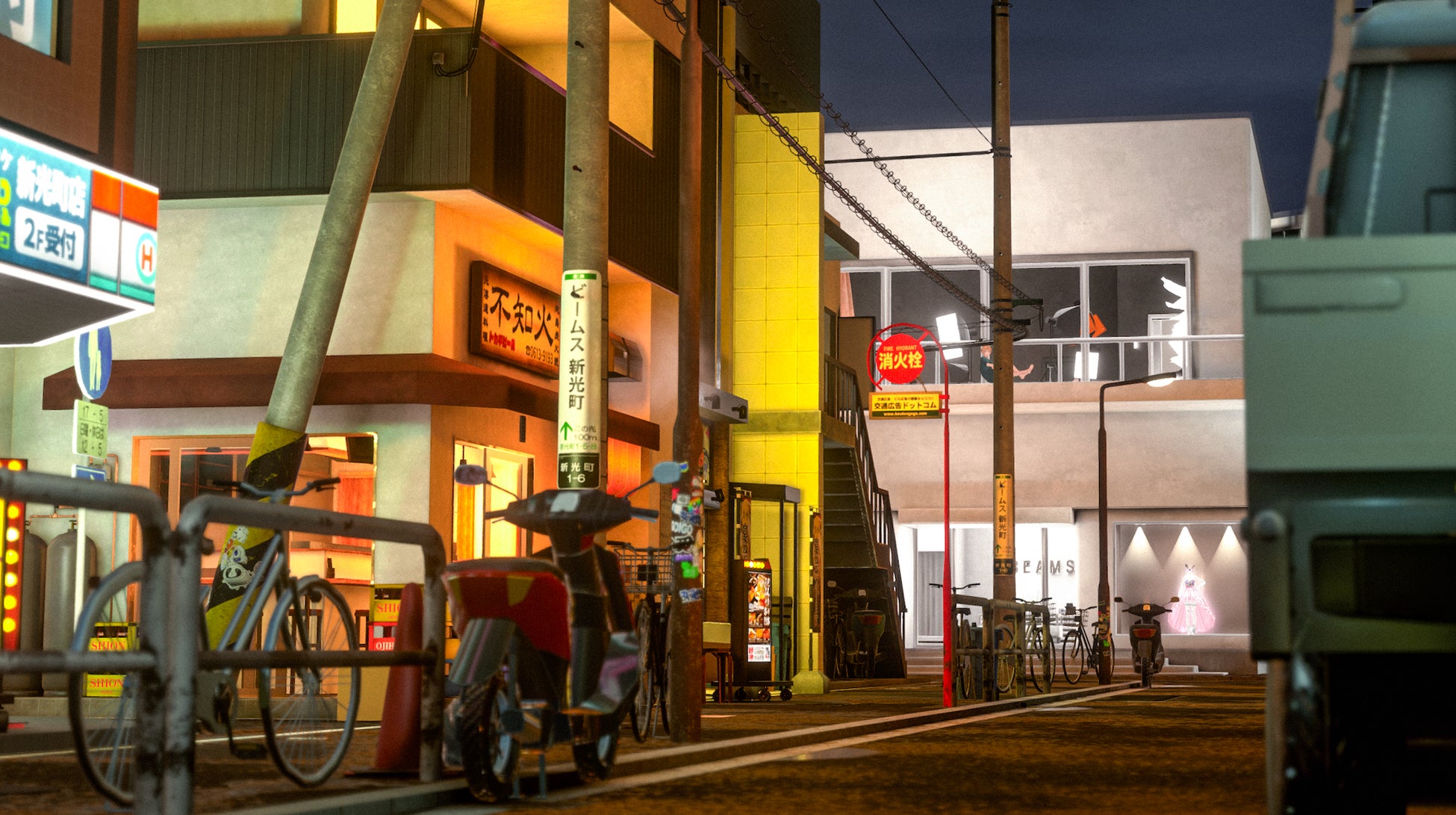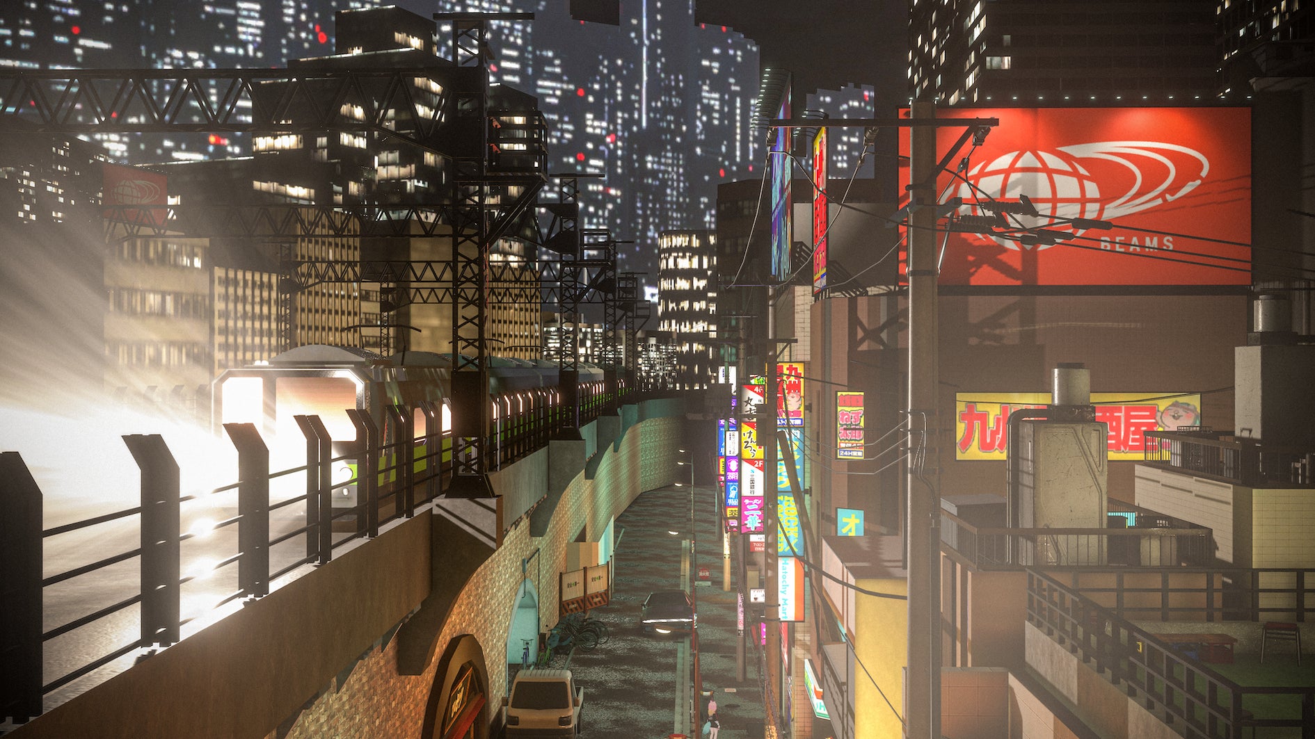 鉄道の高架下に並ぶ飲食店、ゲームセンター、ミュージックバーや、路地裏の居酒屋などは、どれもユーザーが自由に入店することができ、友人同士がバーチャルで会って話したり飲んだりしながら過ごす居場所としてデザインされています。街の奥に佇むBEAMS店舗では、販売中の3D衣装をウィンドウやマネキンに展示し、新商品の発売と共にディスプレイや街中の屋外広告が変化します。