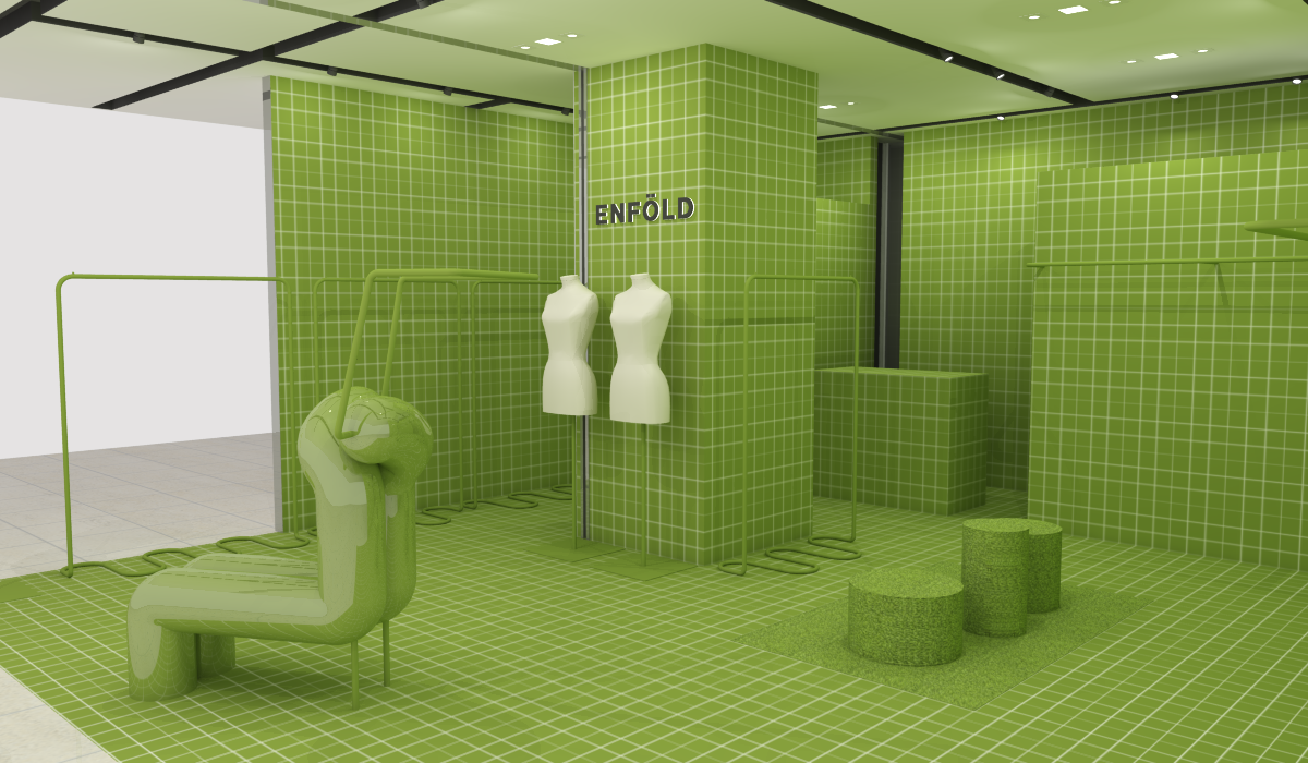 ENFÖLDの世界観とブランド名の「ENFÖLD=包む、抱きしめる」という意味からインスピレーションを受け考えられた内装は、江南店はイエロー、釜山店はブルーといったように、1色で店内をラッピングするデザインになっています。明洞店もまた同様に、グリーンのスクエアタイルで壁面や床を埋め尽くし、Natural(自然的)ともArtifical(人工的)とも捉え難い空間となっています。