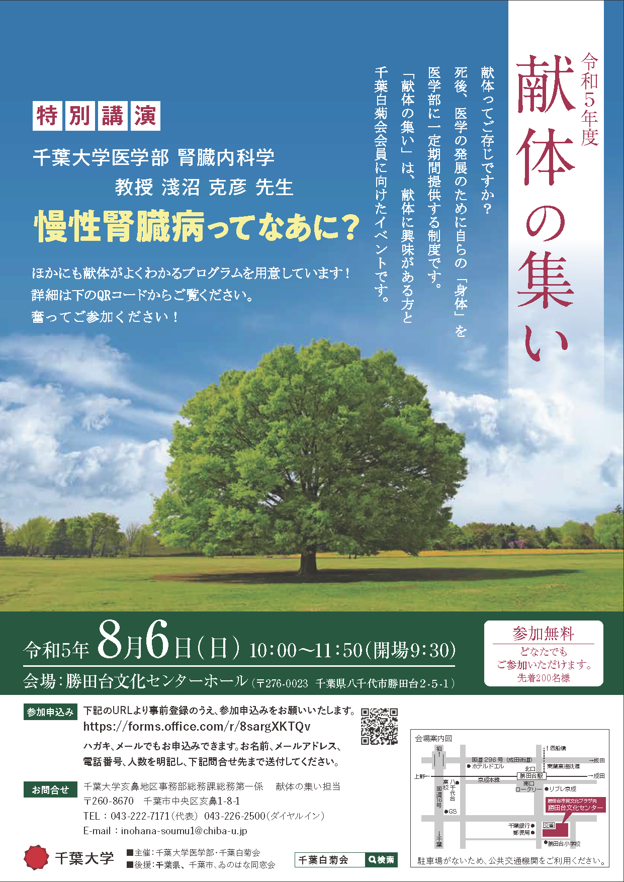 そこで、千葉大学医学部と献体登録者の篤志団体である千葉白菊会は、献体活動を多くの方に知っていただくため、「献体の集い」と題したイベントを以下のとおり開催します。