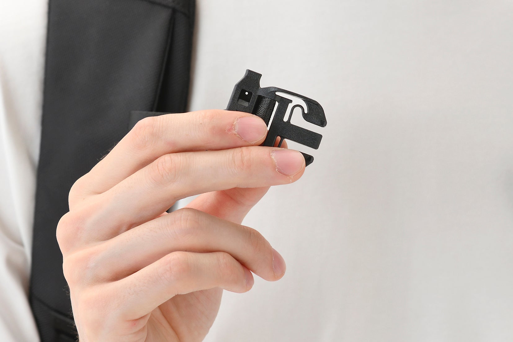 ・非常時に自分の居場所を音で知らせるホイッスル付きバックル。
