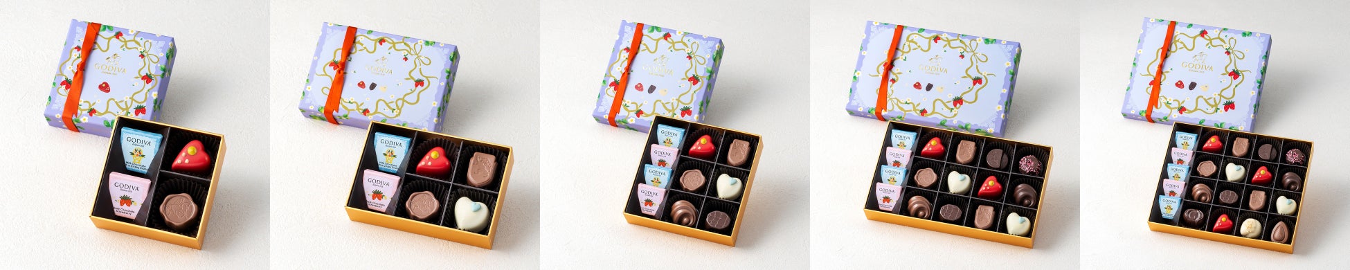 春の訪れや感謝の気持ちを、うす紫色をベースにリボンやまっ赤なイチゴで表現したパッケージに、イチゴ風にデコレーションされた「ストロベリーパイ」をはじめ、ゴディバの伝統的なチョコレートや春らしいカレを詰め合わせました。お世話になった方へのご挨拶や、大切な方へのホワイトデーのプレゼントにもおすすめです。