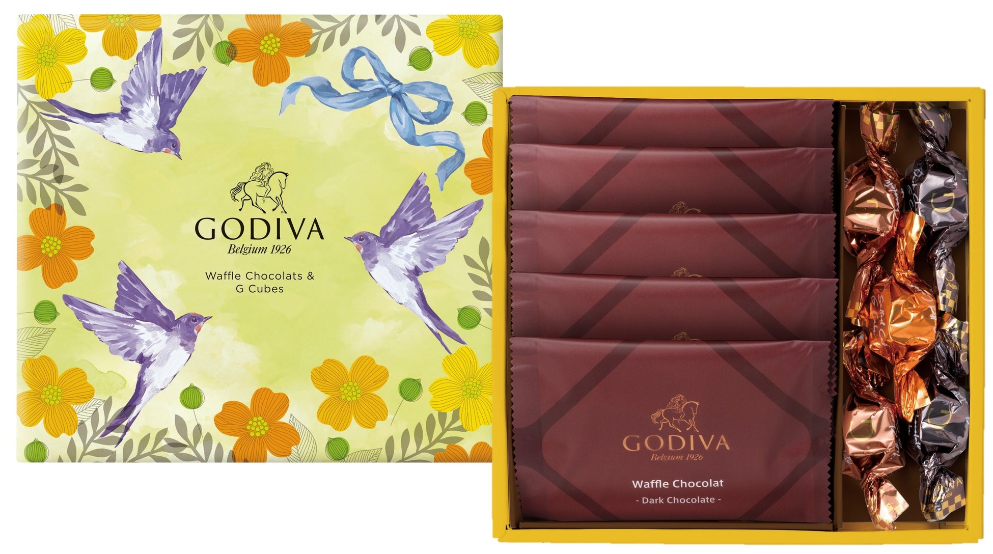 ザクザク食感のクリスピーなワッフル状の生地をベルギー産チョコレートでコーティングした「ワッフルショコラ ダークチョコレート」と、ひと口サイズで本格的な味わいを楽しめるゴディバのチョコレート「G キューブ」3種を、花と小鳥をデザインしたオリジナルパッケージに アソートしました。