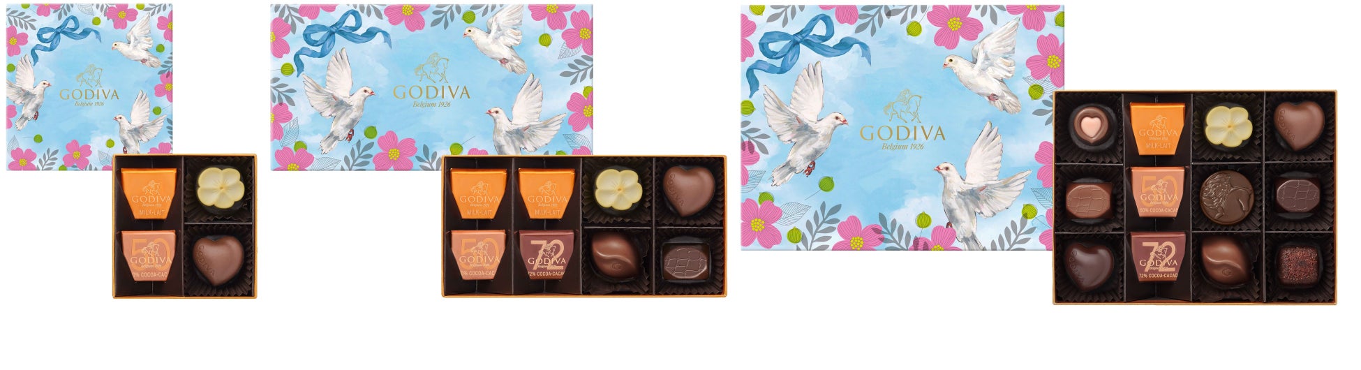 青空へ羽ばたく幸せの白い鳩が描かれたギフトボックスに、香ばしいアーモンドに優しいバニラの風味が調和したアーモンド&バニラや、ゴディバを代表するチョコレートを詰め合わせたホワイトデーコレクションです。(4粒入、8粒入、12粒入)