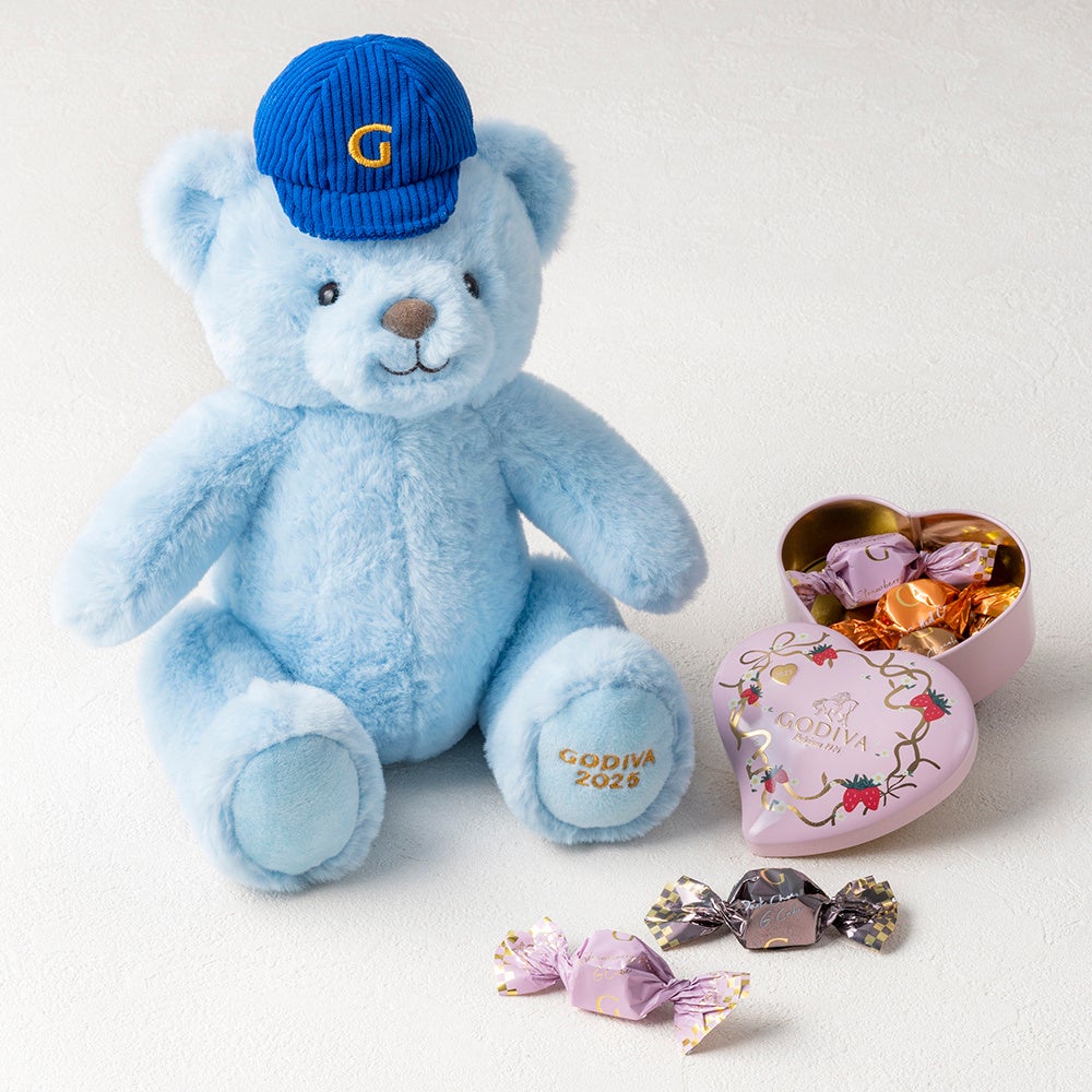 キャップをかぶった春らしい爽やかなブルーの限定ベア。「GODIVA 2025」の刺繍入りです。ストロベリーフレーバーをはじめ4種類のG キューブがアソートされた、ハート形の缶とセットにしました。大切な方へのホワイトデーの贈り物にぴったりです。
