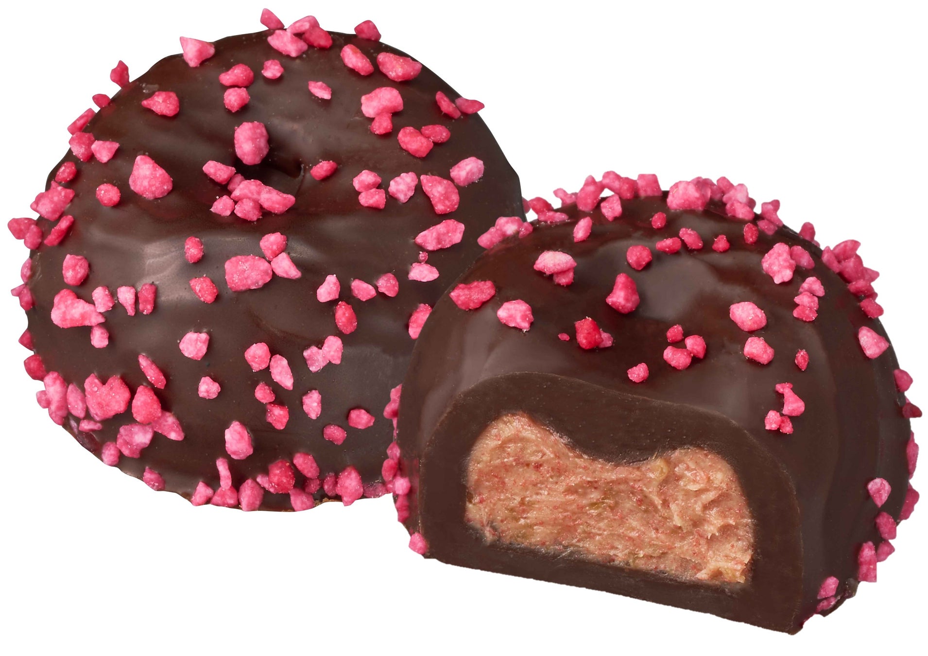 ストロベリームースをダークチョコレートで包み、レッドベリーをトッピングしました。甘酸っぱいストロベリーとほろ苦いダークチョコレートで大人のドーナツをイメージしました。