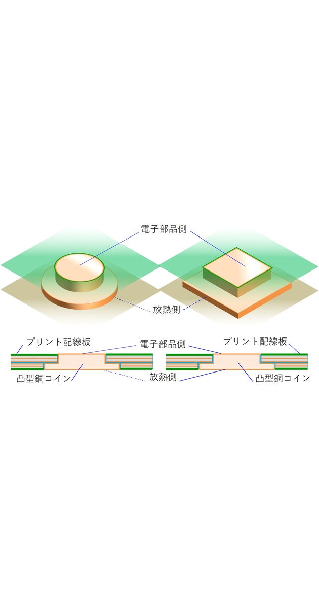 2015年、OTCは熱伝導率(注2)の高い銅(銅コイン)をPCBのスルーホール(注3)に円柱状で挿入し、発熱する電子部品と接合することにより基板の裏側へ放熱させる独自技術「銅コイン埋め込み高多層PCBの設計・量産技術」を実現しました。装置の大きさにより電子部品に放熱部品を直接取り付けられない場合や、イメージセンサーや発光部品など一部が機能面となり放熱部品を取り付けることができない場合に、PCBの裏面に伝熱する銅コインを用いることで高い放熱効率を実現しました。今回、この技術を進化させ、さらに約2倍の放熱効率(注4)を達成する「凸型銅コイン」の開発に成功しました。