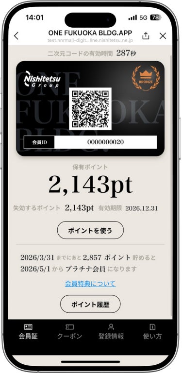 当アプリでは、「ONE FUKUOKA BLDG.(以下、ワンビル)」でのお買い物やお食事のご利用でポイントを貯めることができ、貯めたポイントは500ポイントごとに500円分としてお支払いにご利用いただけるほか、年間取得ポイント※に応じた特典のプレゼントも予定しています。また、最新のキャンペーン情報の配信や、ワンビルで開催するイベントへの応募機能の追加(5月1日~)も予定しています。