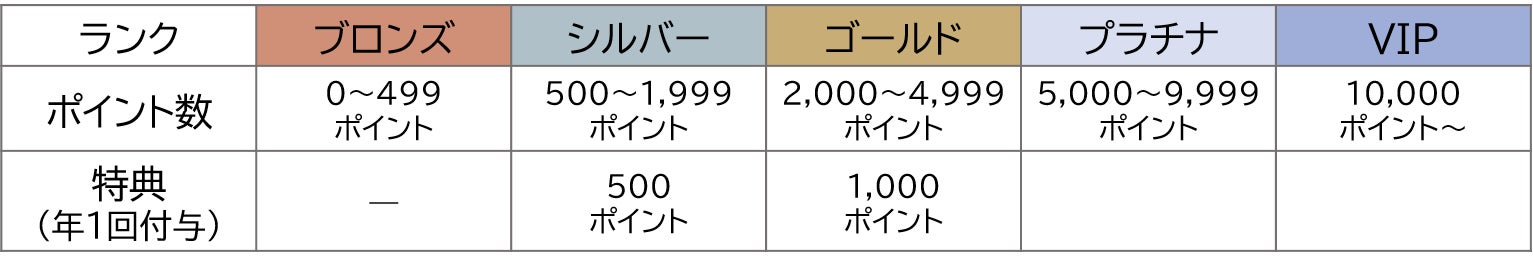 毎年、4月~翌年3月の間に獲得したポイント数に応じて、翌年5月からのランクが決定します。
