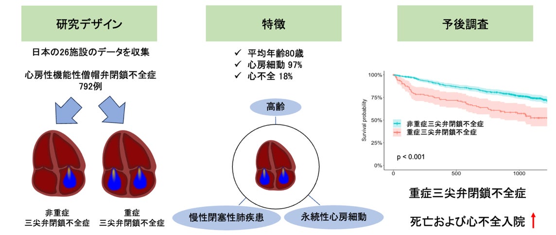 日本の26施設の共同研究であるREVEAL-AFMR研究に登録された1,007例の心房性機能性僧帽弁逆流症のうち792人のデータを用いて調査を行いました。心房性機能性僧帽弁逆流症の14.9%に重症三尖弁逆流症を合併しており、その平均年齢は80歳と高齢で93%に永続性心房細動を合併し、45%が心不全入院を経験していました。高齢であったり、永続性心房細動、慢性呼吸性肺疾患にかかっていたりすることが重症三尖弁逆流症を併発しやすく、重症三尖弁逆流症患者は非重症患者と比較し、死亡及び心不全入院率が高い結果でした。