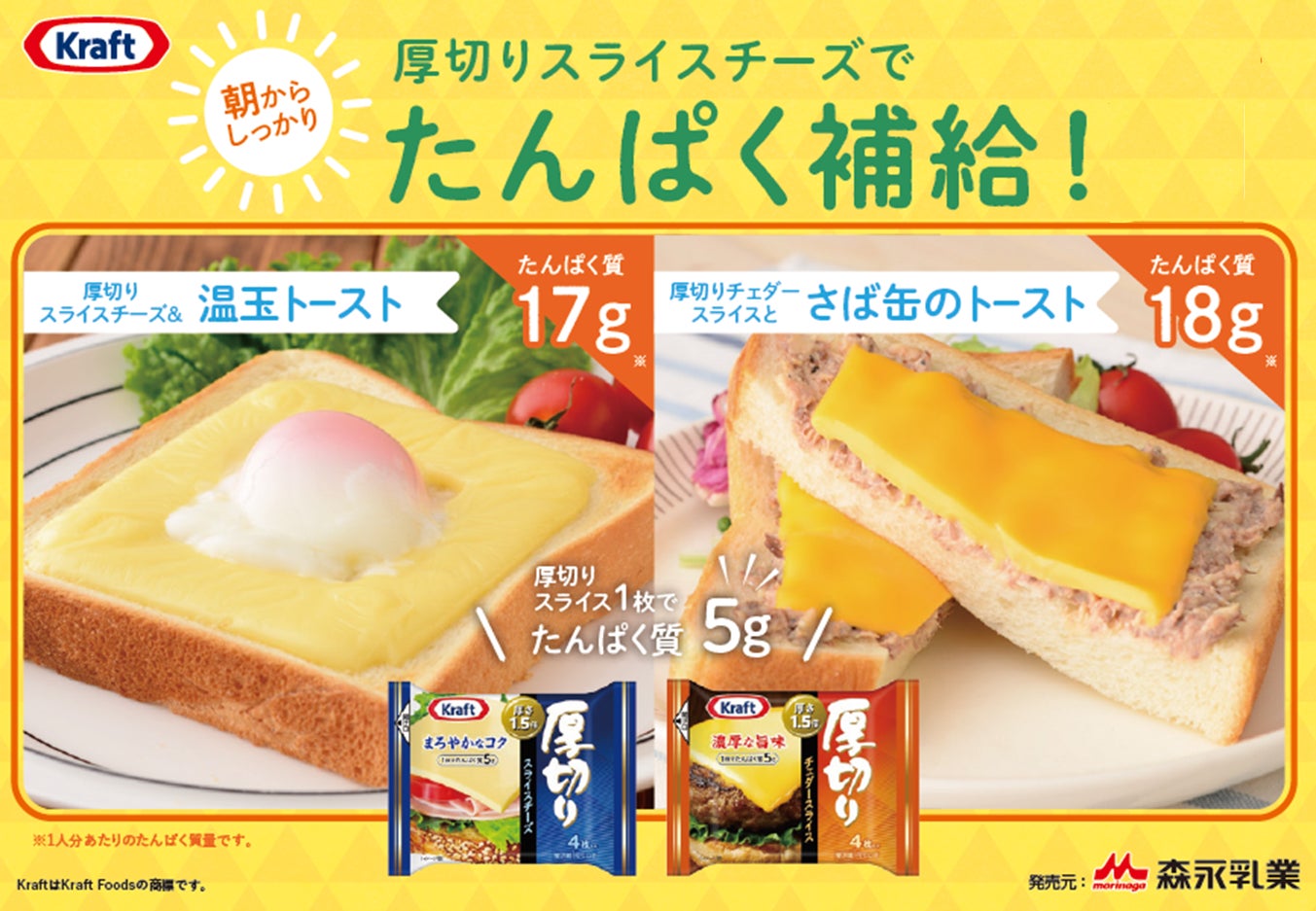 森永乳業は、「クラフト 厚切りスライスチーズ 4枚」、「クラフト 厚切りチェダースライス 4枚」を