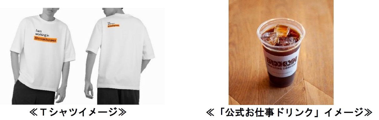 「I am working in Shimokitazawa」では、下北沢に働きに来た人が自身の名刺と交換できる共通Tシャツを、8月1日(月)~8月5日(金)の5日間限定で無料配布します。期間中は下北沢で働く際にTシャツの着用を呼びかけ、Tシャツを着用した人が街に溢れることで、“下北沢で働く”を実感できる1週間を目指します。Tシャツ着用者には「公式お仕事ドリンク」としてB街区に開業する「BROOKLYN ROASTING COMPANY」のコーヒーチケットのプレゼントや、最終日8月5日(金)にはTシャツ着用者限定で、DJやついいちろう(エレキコミック)やライトガールズも出演するシークレットライブ「おつかれフェス」を開催します。