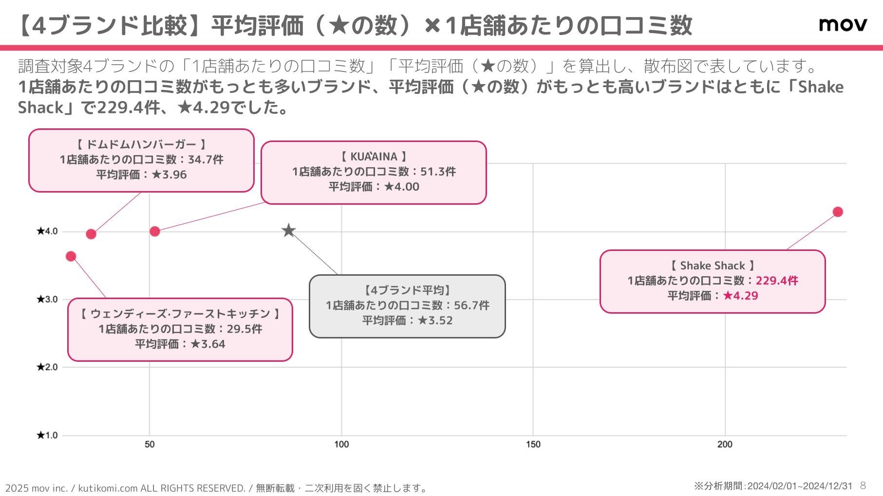 ■ 1店舗あたりの口コミ数が多く、平均評価が高いブランドは「Shake Shack」