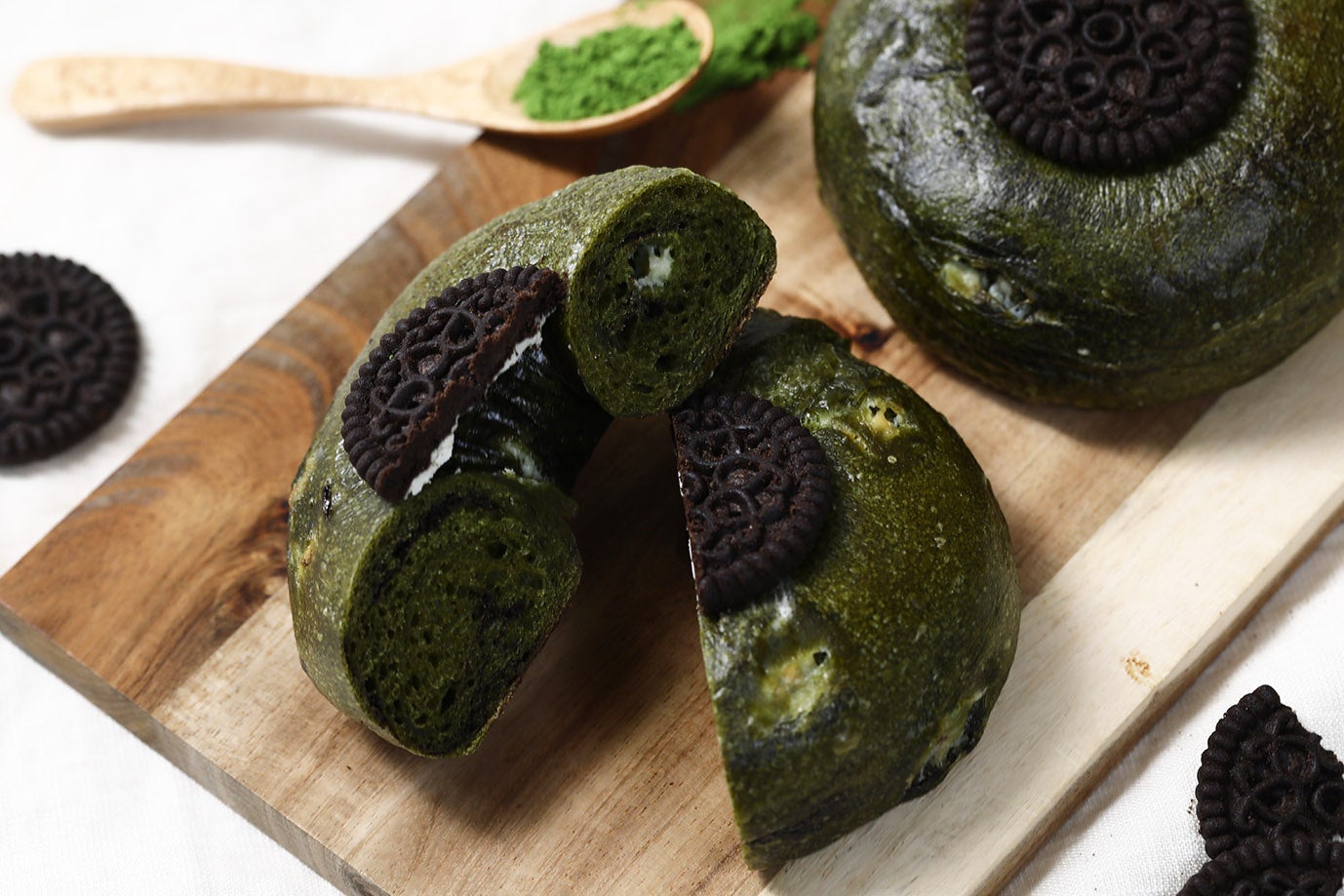 グランディールで人気のベーグルの季節限定商品です。抹茶生地にホワイトチョコとココアビスケットを練り込み、ココアビスケットを丸ごと1枚トッピングした今までにない大人なベーグル。もっちりとした生地とともに、抹茶の渋味とホワイトチョコの甘味をお楽しみください。