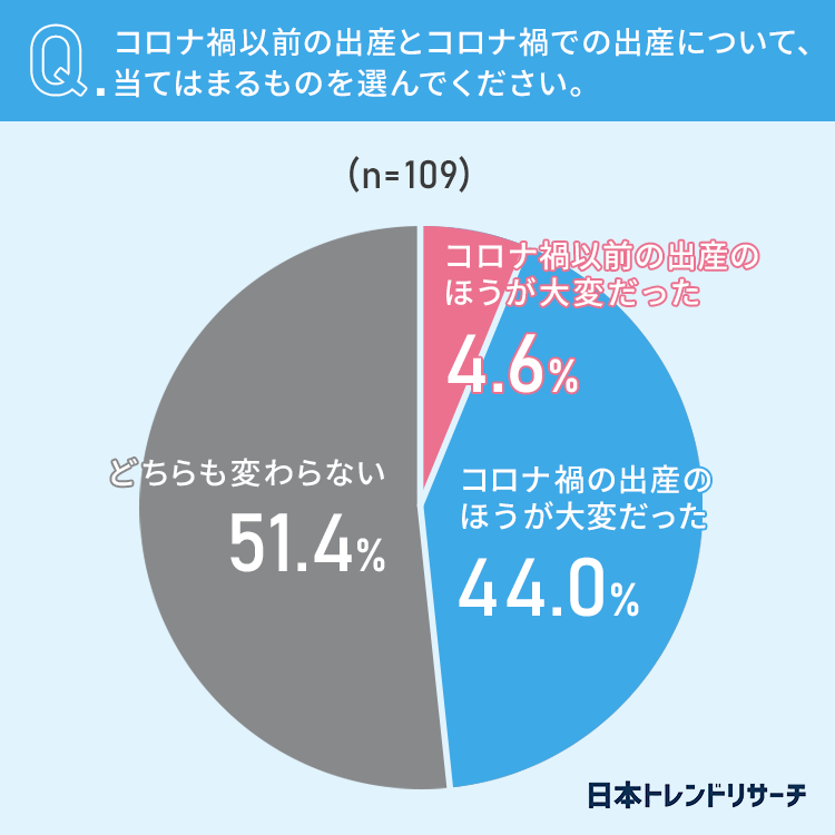 44%の方が「コロナ禍の出産のほうが大変だった」と回答しましたが、「どちらも変わらない」と感じている方が51.4%と、もっとも多いようです。