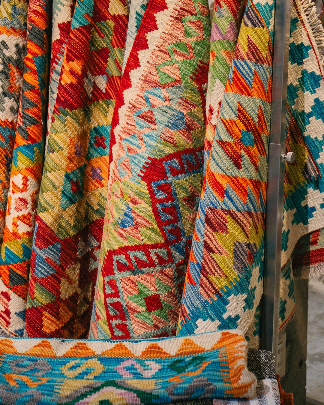 モロッコやフランス、インドなど世界各地より買い付けた、ベニワレンやキリムなどのラグやクッション、刺し子ブランケットが取り揃います。