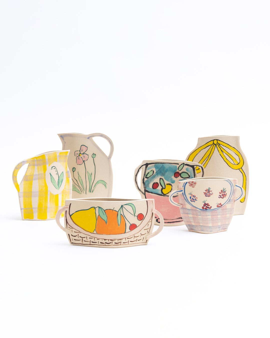 キャンバス地のような質感の土に色とりどりの植物モチーフが描かれた作品たちは一輪挿しとしてはもちろん、お部屋に飾るだけで絵画のように楽しんでいただけます。