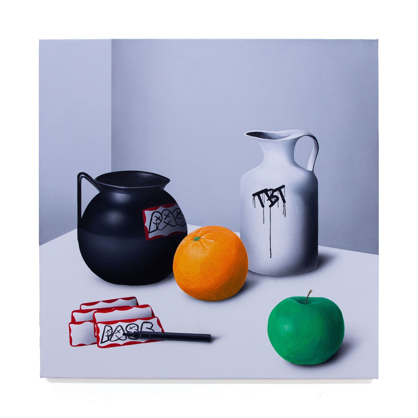 テーブルには富と実りの象徴としての果実が転がり、花瓶にはグラフィティーアートのスローアップやタギングが重なる。