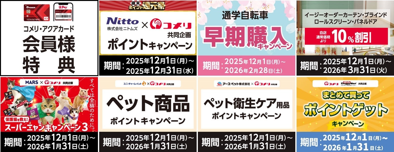 ホームセンターの「コメリパワー」や「コメリハード&グリーン」を通し地域のライフラインであり続けたいと願う株式会社コメリ(所在地:新潟県 新潟市、代表取締役社長:捧 雄一郎)は、コメリの決済手段「コメリカード」「アクアカード」会員様特典として、2025年12月から7種の期間限定キャンペーンを新たにスタートいたしました。