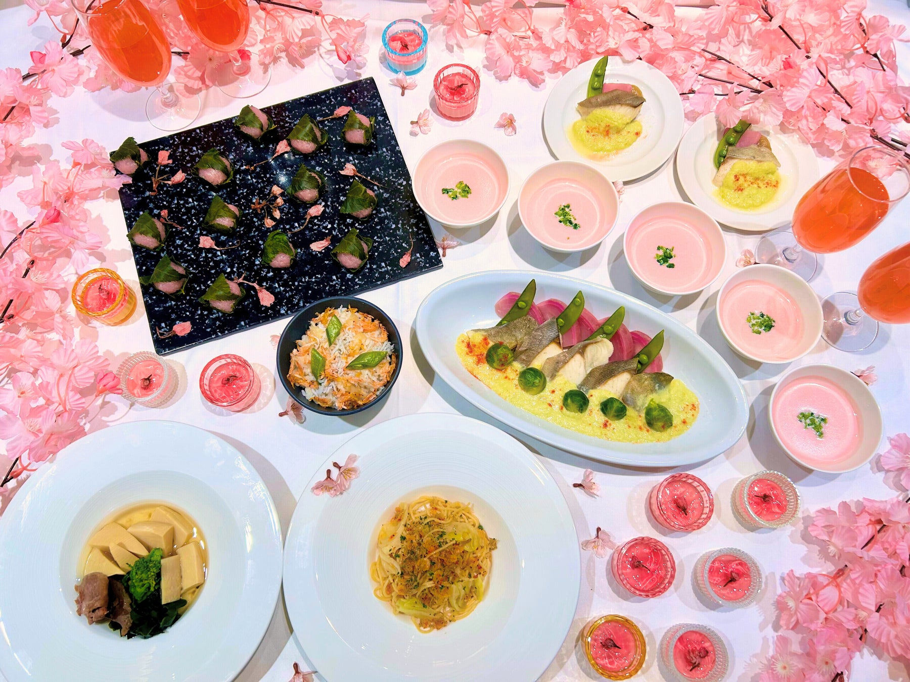桜の淡いピンク色が美しい「桜のポタージュスープ」、春キャベツを使った「白身魚ポワレ 春キャベツソース」、風味豊かな「マグロのほほ肉たけのこ添え」など、季節感あふれる料理が並びます。さらに、「桜エビとしらすのペペロンチーノ」、「桜エビと帆立のご飯」など春の海の幸を堪能できる料理も登場し、春ならではの味覚を存分に味わえます。デザートには桜がほのかに香る「桜のパンナコッタ」、関西風の「道明寺桜餅」といった見た目にも華やかな春の一品が楽しめます。