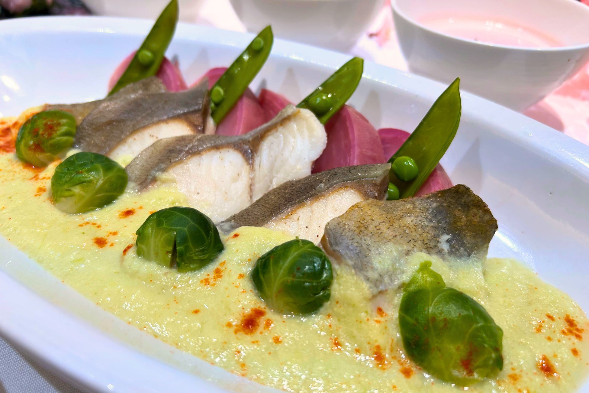 春キャベツのピューレを使用したまろやかなソースが香ばしく焼き上げた白身魚と絶秒にマッチ。
