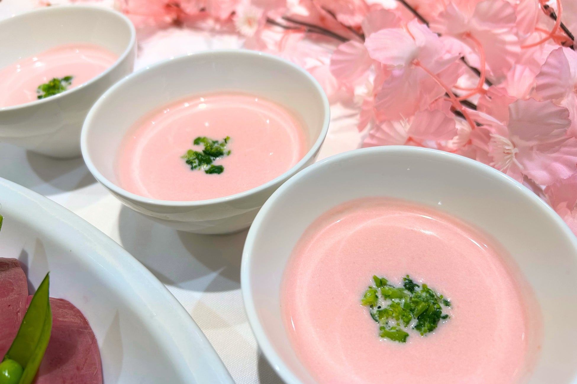 ビーツとじゃがいもをベースにしたポタージュに桜の香りを加えた一品。まろやかでクリーミーな舌触りと桜の風味が調和し、春の訪れを感じさせてくれます。