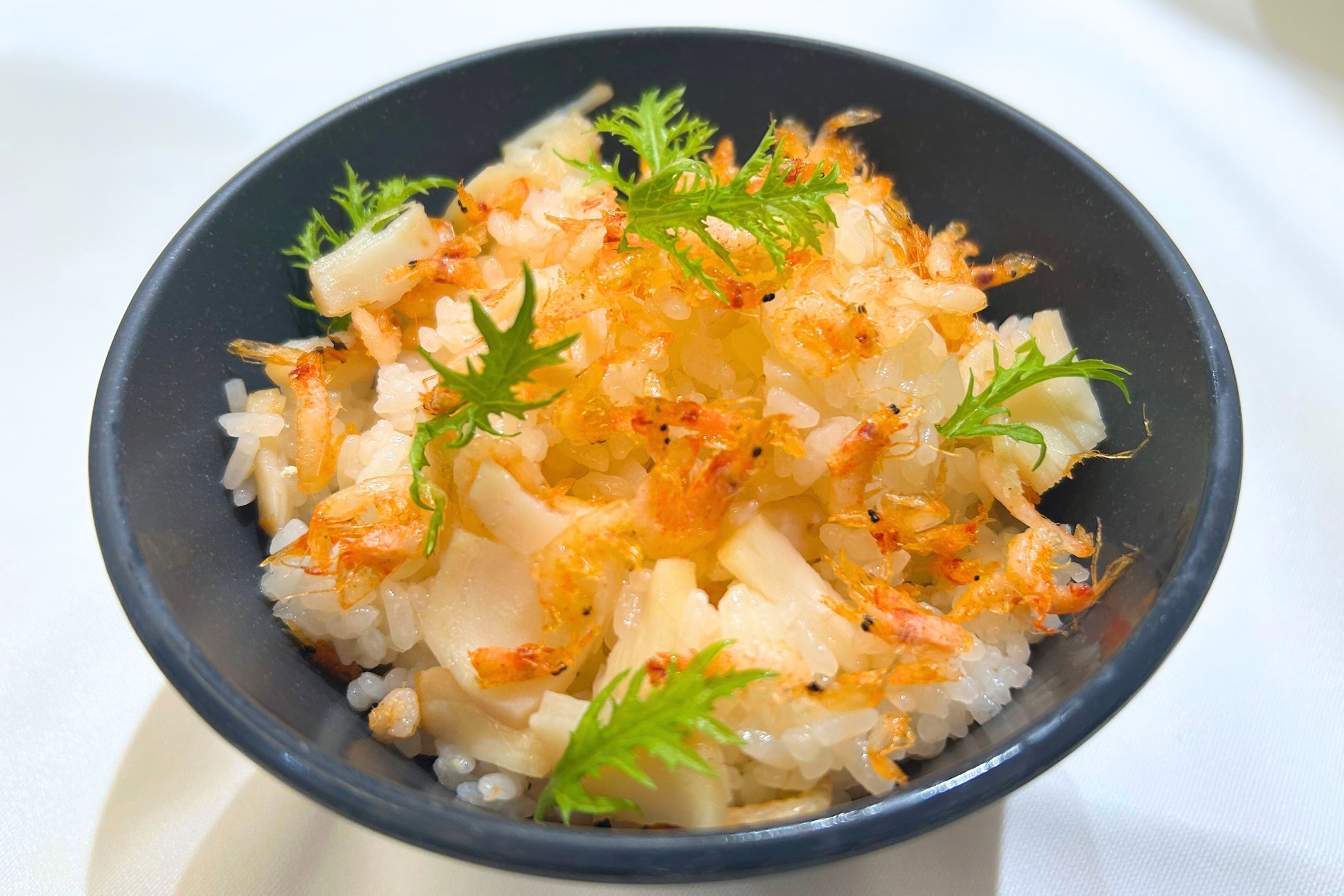 帆立の出汁が効いた、桜エビの香りが香るご飯。海の幸の風味が豊かに調和し、食べるたびに深みのある美味しさが広がります。