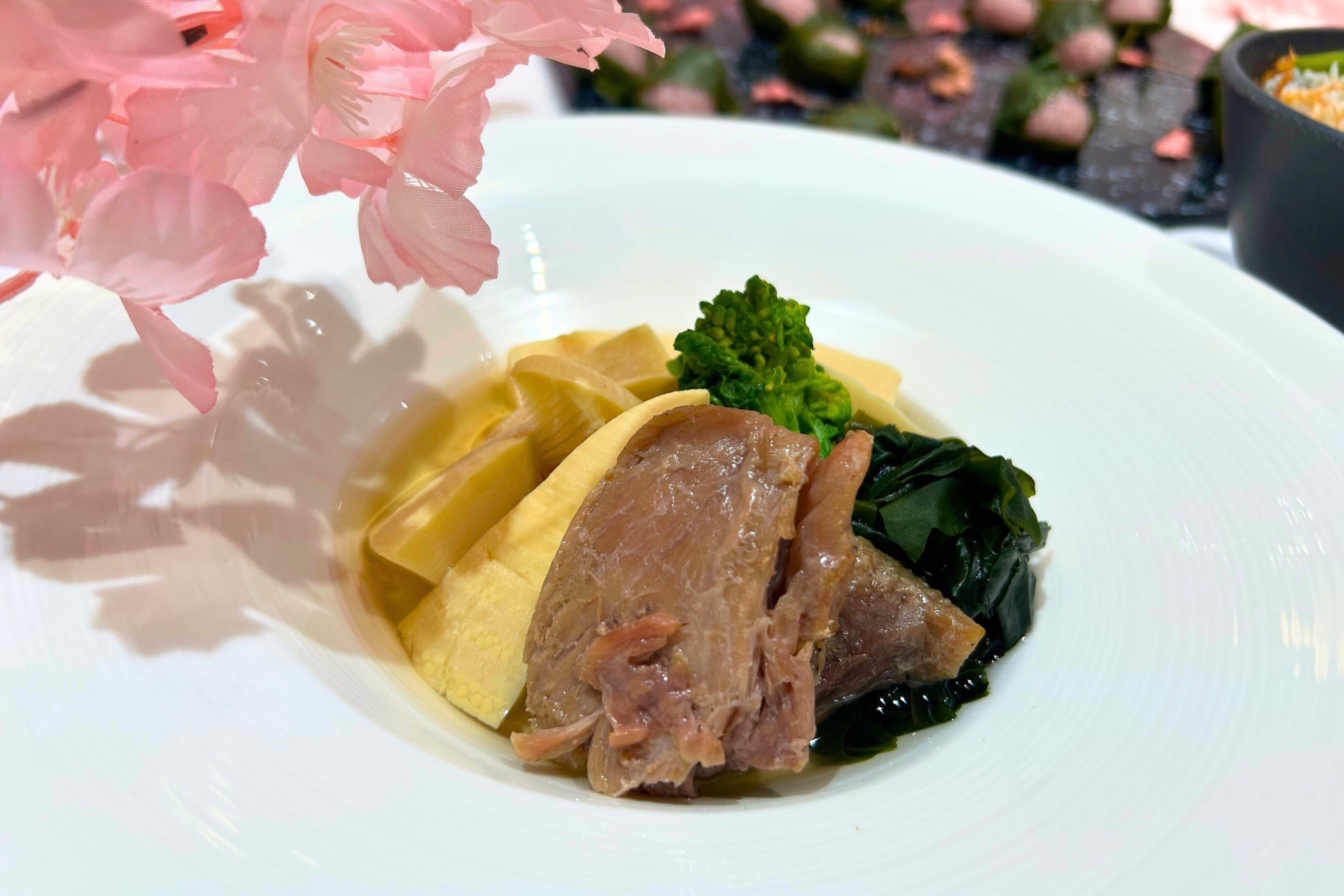 醬油ベースに煮込んだ柔らかく旨みたっぷりのマグロのほほ肉にたけのこを使った土佐煮を添えました。素材の風味を活かした春らしい和の一品です。