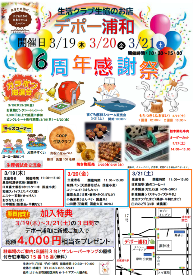 生活クラブ生活協同組合・埼玉(本部:埼玉県川口市、以下生活クラブ)の店舗「デポー浦和」は、2026年3月19日(木)から3月21日(土)の3日間「デポー浦和6周年まつり」を開催します。