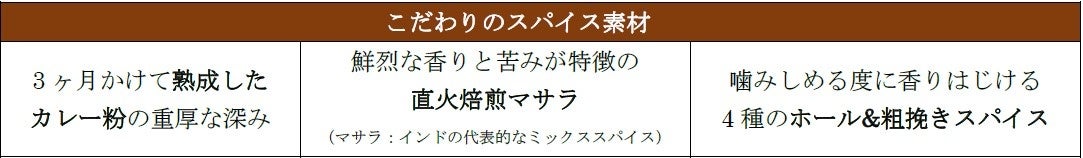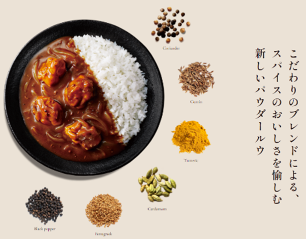 スパイスに関する技術・知見を結集し、当社ならではのブレンドと加工技術により、こだわりの素材を掛け合わせました。「スパイスの芳ばしさ」にこだわり、スパイス素材の味わい、香り、食感を楽しめる新たなおいしさを提供します。口に入れた瞬間から食べた後の余韻まで、「スパイスの芳ばしさ」が広がり、鮮烈な香りとともに、高温焙煎した玉ねぎのコク、チキンやトマトの旨みを楽しめます。