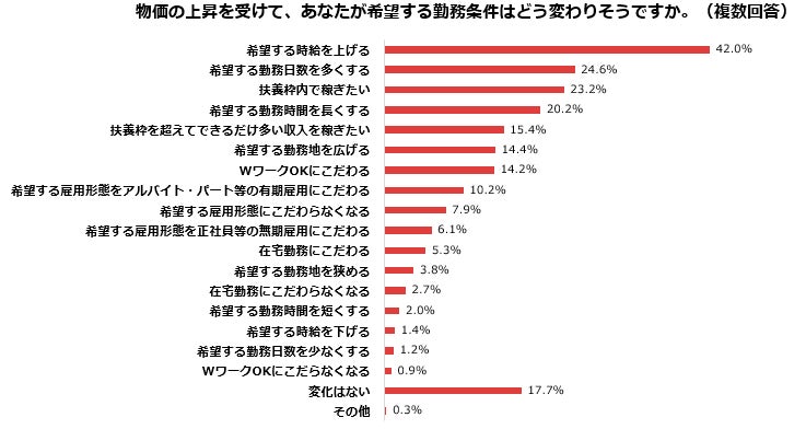 - 物価の上昇を受けて、希望する勤務条件はどう変わりそうか 1位「希望する時給を上げる」42.0%