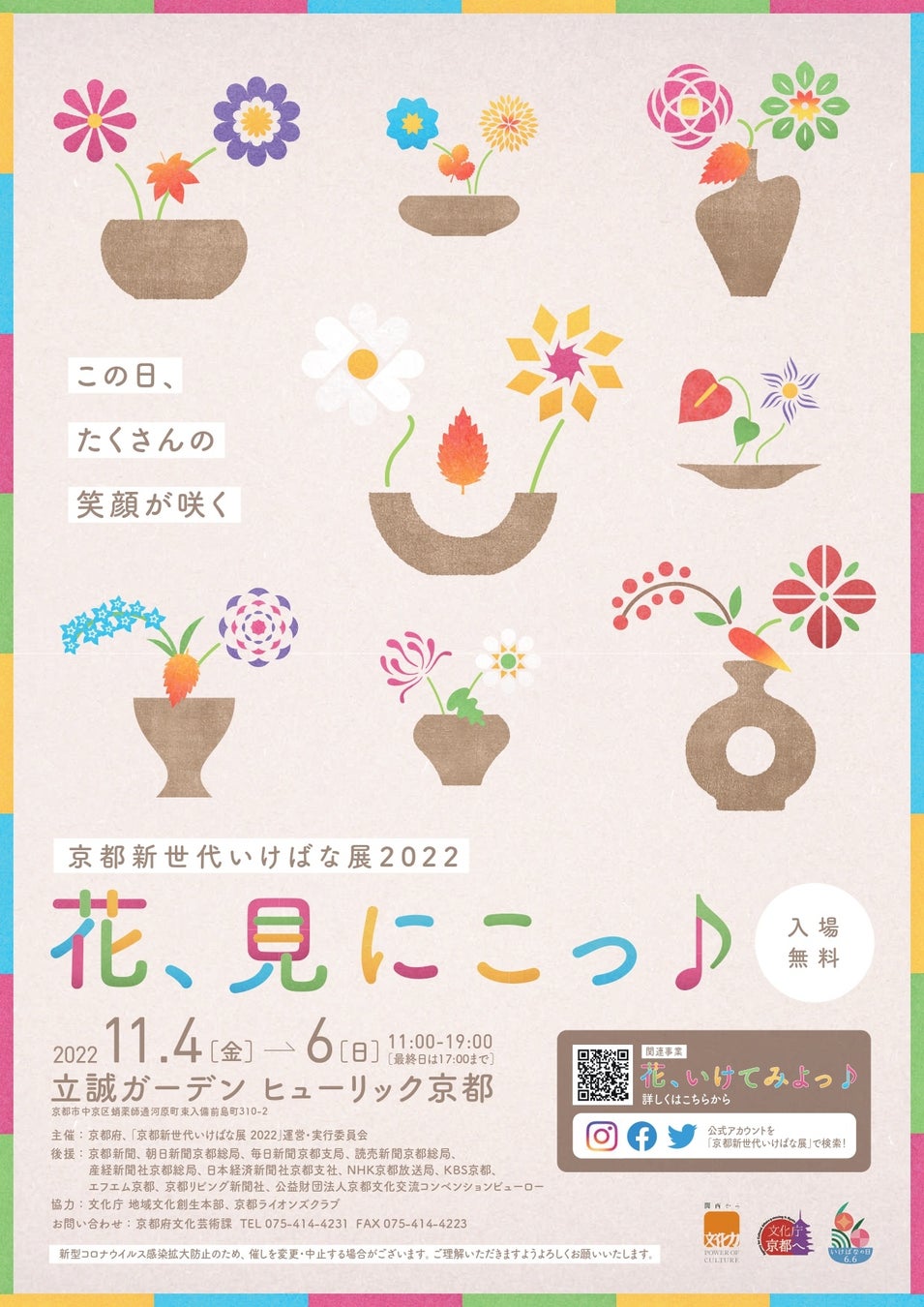 京都府では、華道界とともに隔年で「京都新世代いけばな展」を開催しており、今回はより若い世代にいけばなの魅⼒を知っていただくため、会場や展⽰⽅法、関連事業を⼀新して開催します。「花、⾒にこっ♪」をテーマに、弾んだ気持ちで、気軽に伝統⽂化に触れることのできる企画となっています。「いけばな体験」などのワークショップにもご参加いただけますので、是⾮お越しください♪(※いけばな体験は予約制です。)