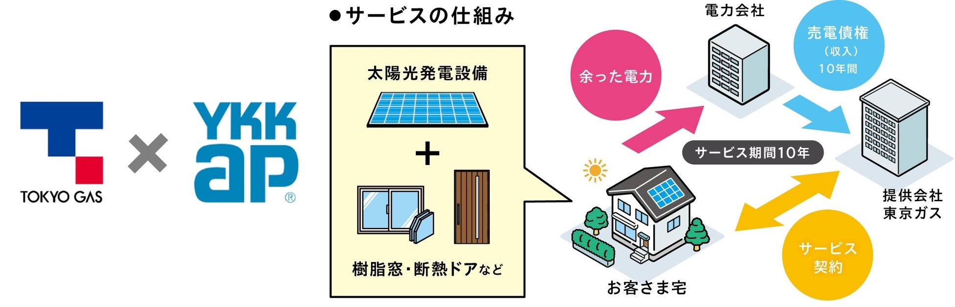 東京ガスが提供する太陽光発電設備と、YKK APが提供する高断熱な「APW」樹脂窓シリーズと断熱玄関ドア、エクステリアまたはインテリア商材をセットで導入し、太陽光発電設備の余剰電力の売電債権を東京ガスが保有することで、お得な費用でご利用いただけるサービスです(一部容量帯においては太陽光サービスを0円で導入可能 ※3)。10年間のサービス期間終了後は、売電収入も見込めます。