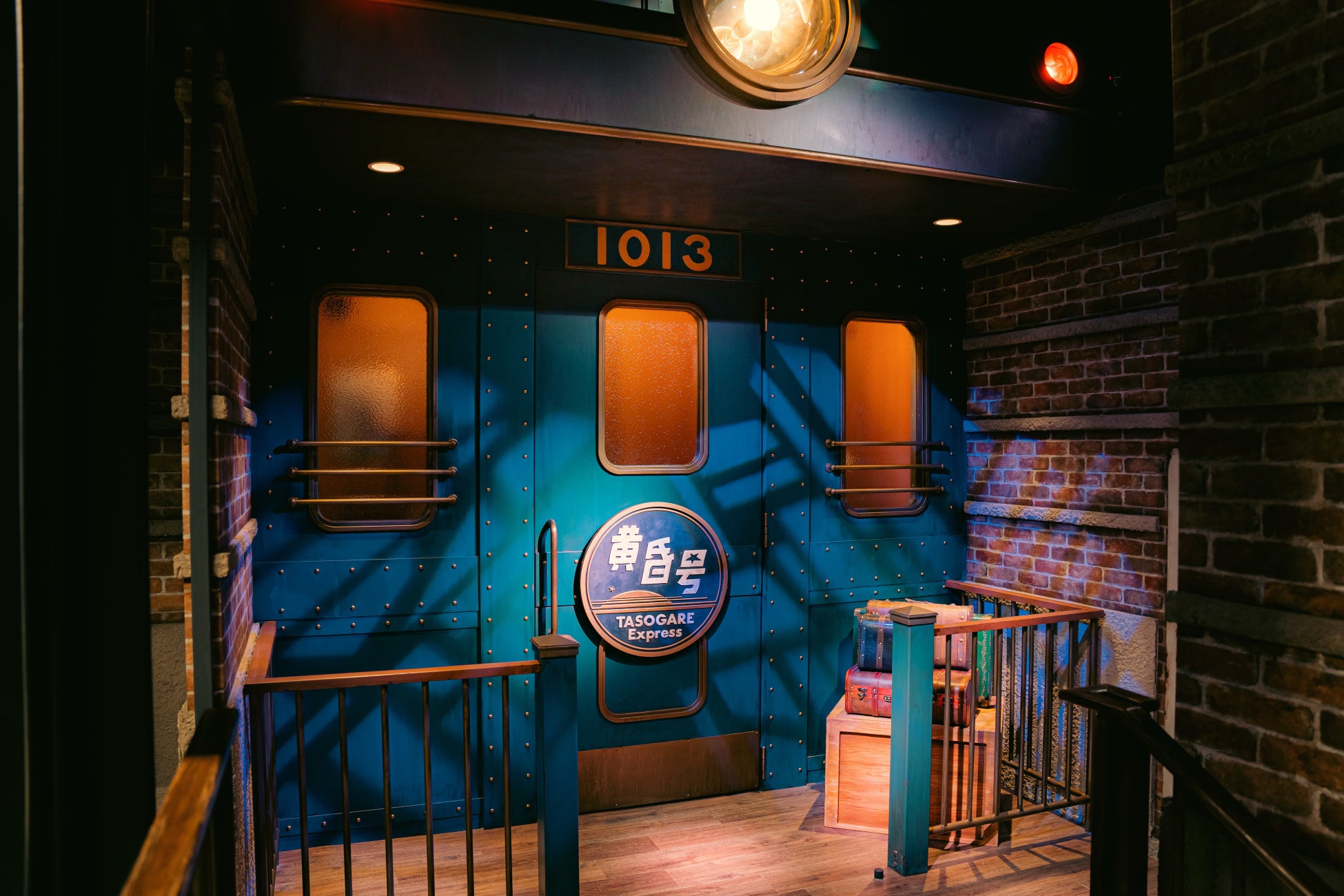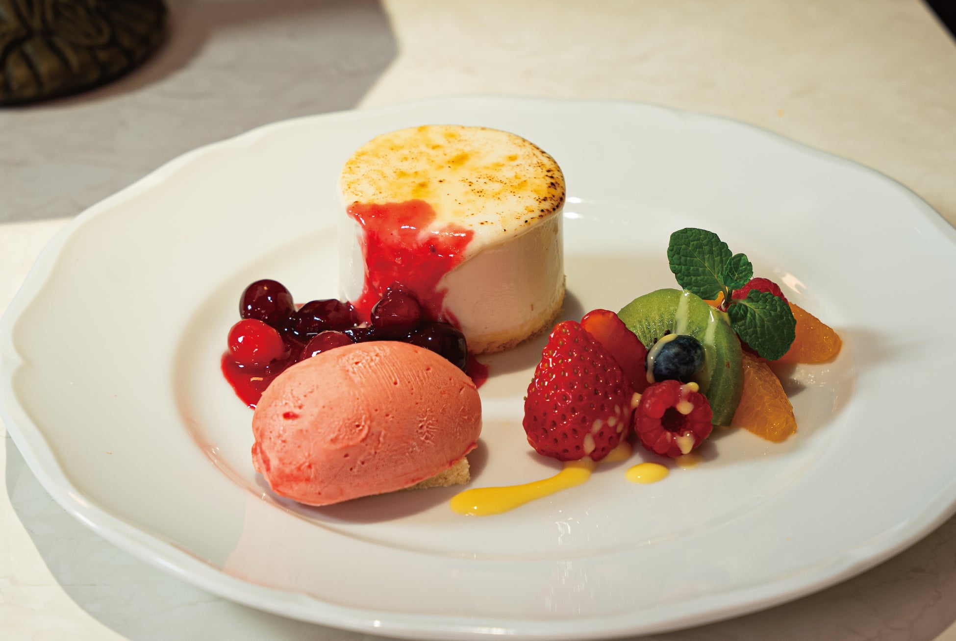 食堂車レストラン 黄昏号では、クリームチーズのムースにストロベリーアイスとフルーツを添えた彩り豊かな「デザートプレート チーズブリュレ」をご用意。レストランの入口は駅の構内をイメージしており、豪華列車の装いの店内には臨場感溢れる音と車窓を模したディスプレイに四季折々の風景が流れます。まるで鉄道旅行のような体験が味わえる空間で、お食事を堪能できます。