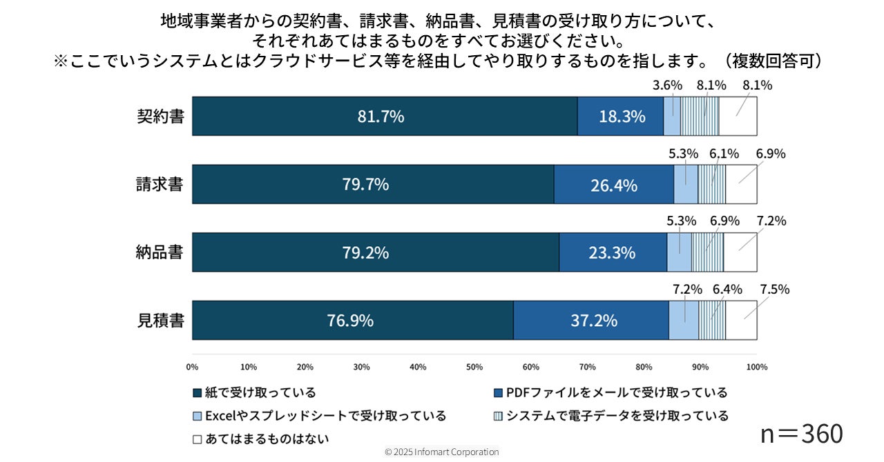地域事業者からの契約書、請求書、見積書、納品書の受け取り方法について聞いたところ(n=360)、いずれの帳票においても、「紙で受け取っている」が最多となりました。特に「契約書」は81.7%、「請求書」は79.7%、「納品書」は79.2%と、約8割の自治体が紙で受け取っています。自治体と地域事業者との取り引きでは、その多くが紙でのやり取りとなっていることが明らかになりました。
