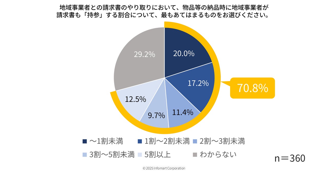 また、物品等の納品時に、地域事業者が請求書を持参する割合を聞いたところ、20.0%が「〜1割未満」と回答し、もっとも多い割合となりました。「~1割未満」から「5割以上」と回答した割合を合計すると70.8%となり、7割以上の自治体では地域事業者が請求書を持参している状況が明らかになりました。