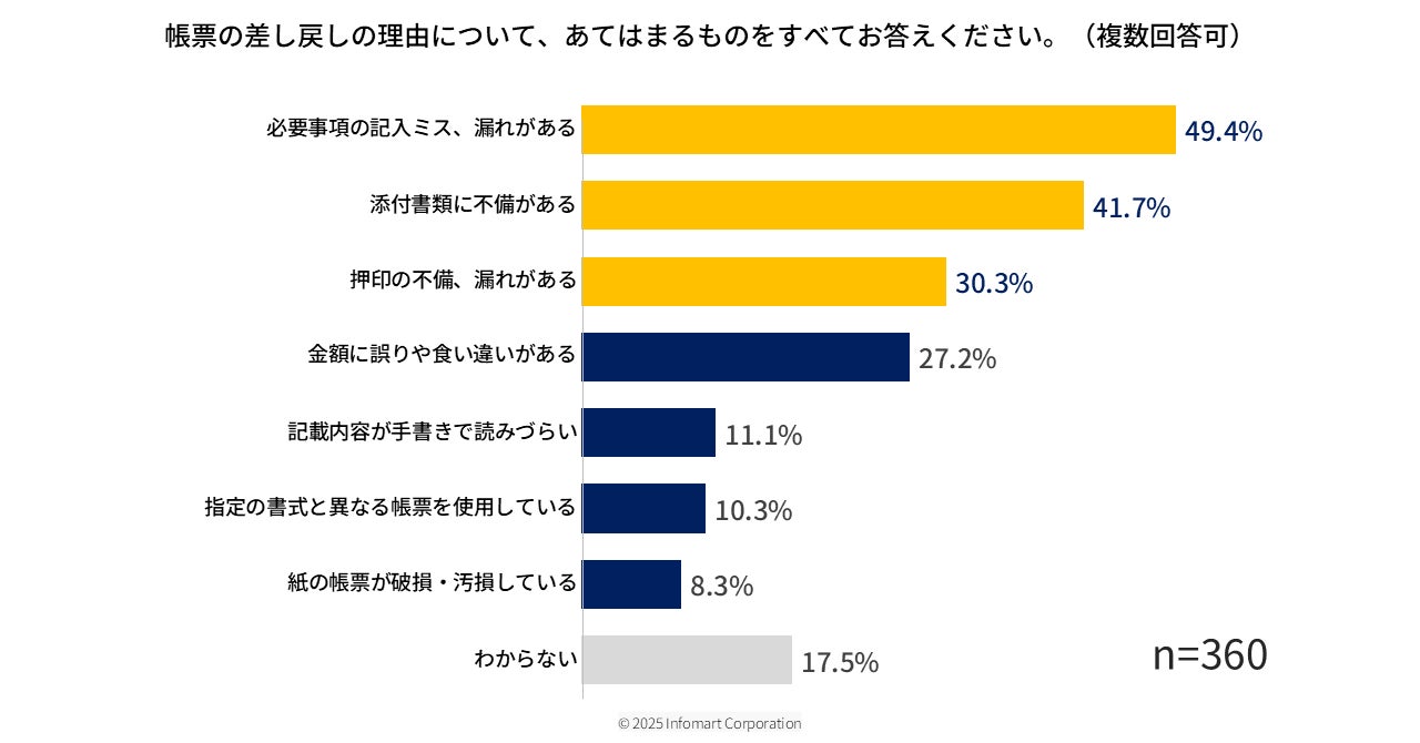 また、帳票の差し戻しの理由について聞いたところ(n=360)、「必要事項の記入ミス、漏れがある」が49.4%で最多となりました。次いで、「添付書類に不備がある」の41.7%、「押印の不備、漏れがある」の30.3%が続きます。記入ミスや添付書類の不備、押印の不備等が起因となる差し戻しによって、処理・支払い遅延等のリスクが高まると考えられます。
